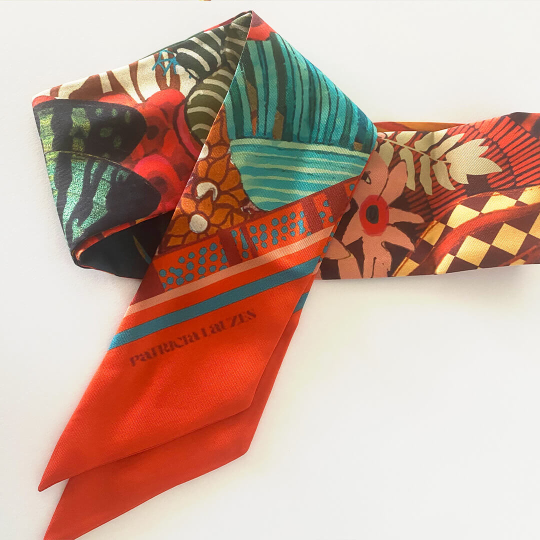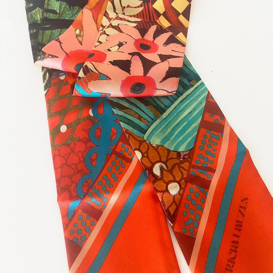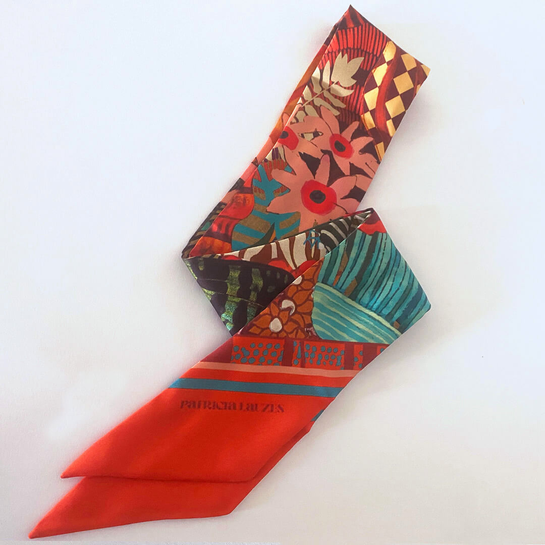 Le Twilly est un petit accessoire de soie imprimée, comme un ruban, à porter de mille façons. Il se décline selon les envies : il peut se porter autour du cou, dans les cheveux ou au poignet.