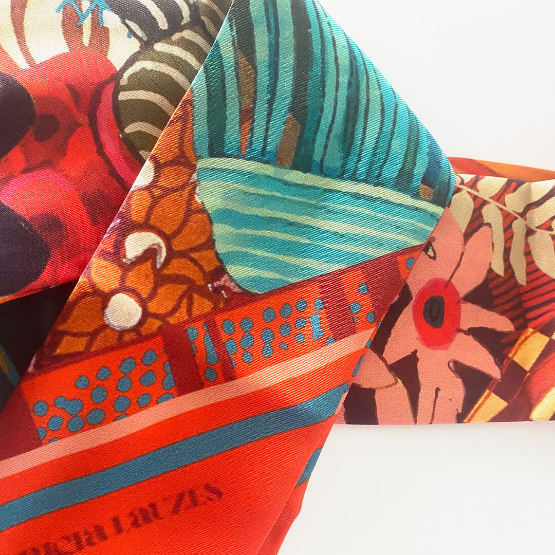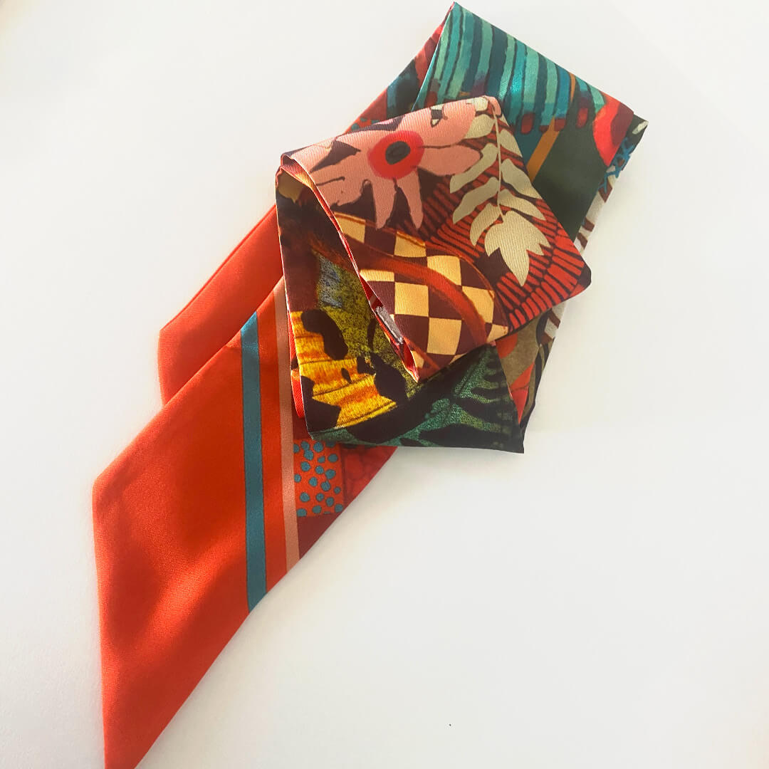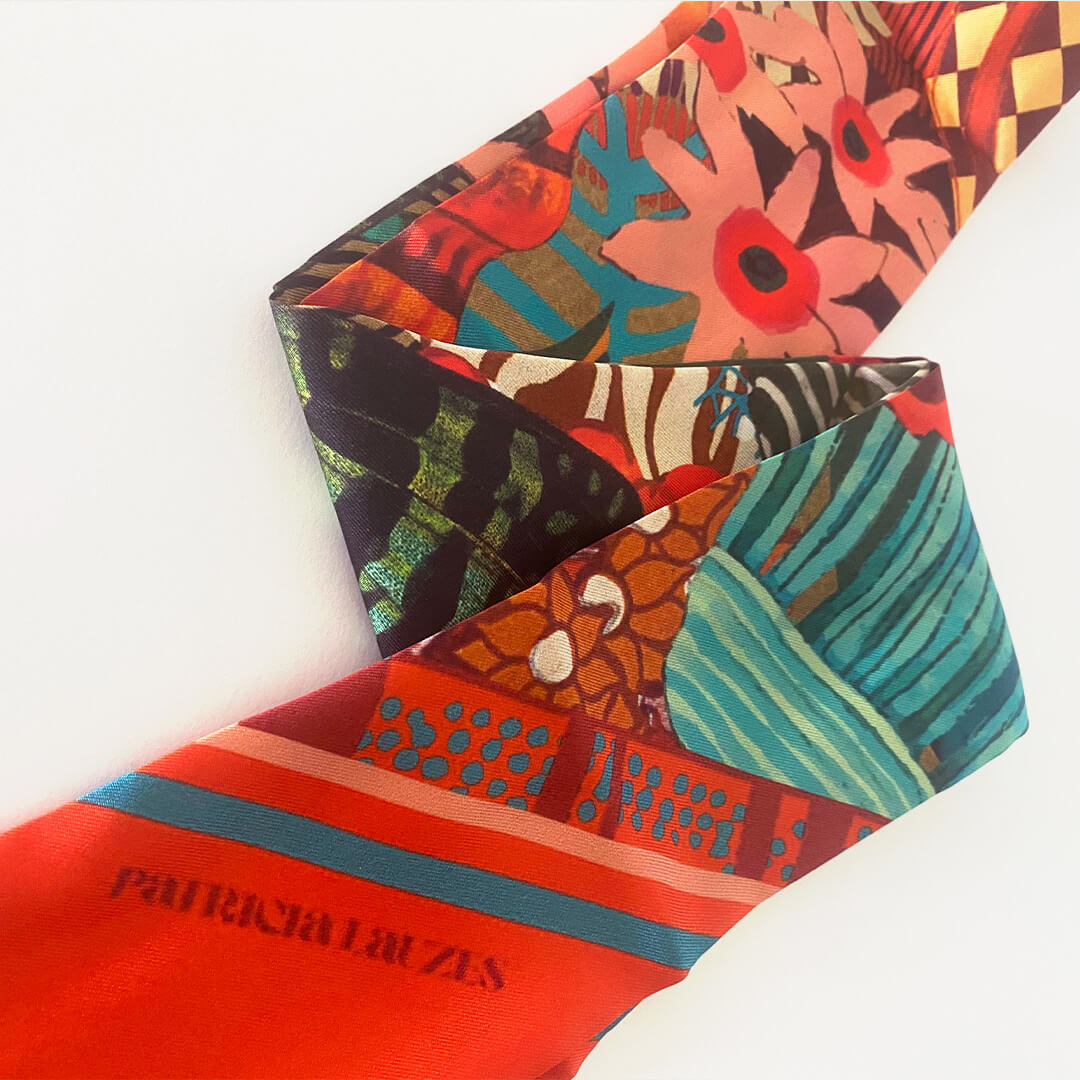 Le Twilly est un petit accessoire de soie imprimée, comme un ruban, à porter de mille façons. Il se décline selon les envies : il peut se porter autour du cou, dans les cheveux ou au poignet.
